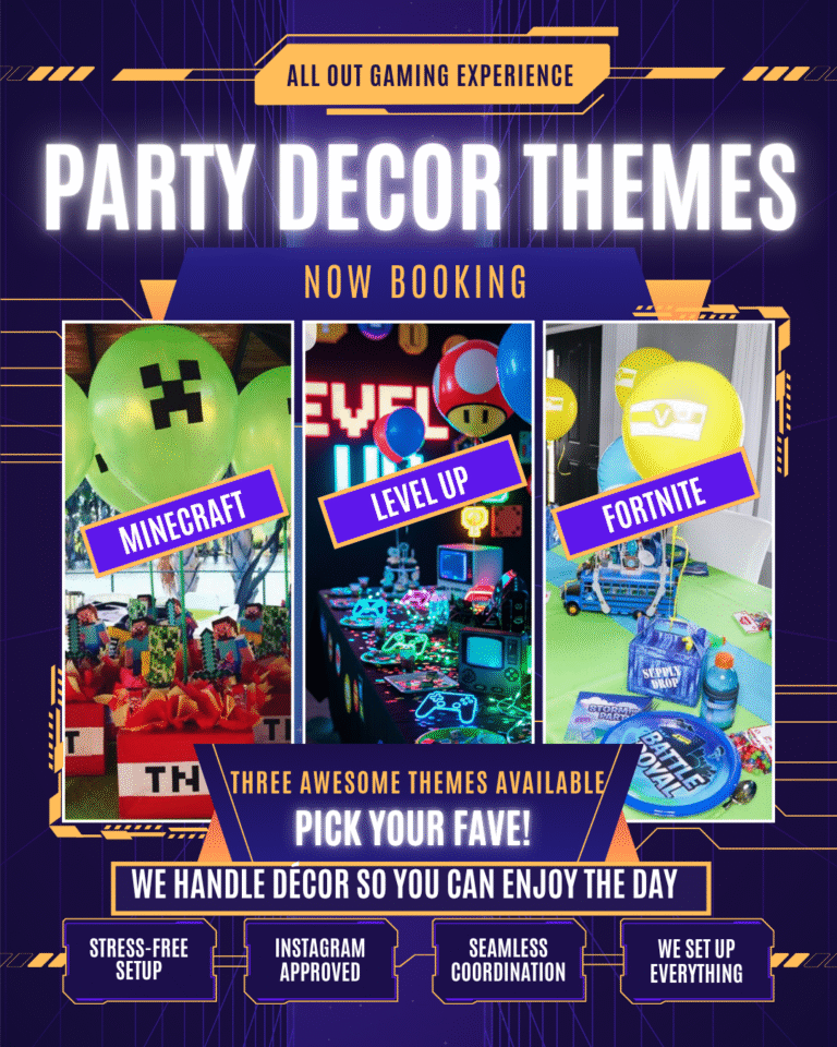 Add custom themed décor to elevate your party experience. Choose from Fortnite, Minecraft, or Level Up themes. Includes balloons, backdrop décor, table accents, and photo-ready setups — all styled before your event begins.